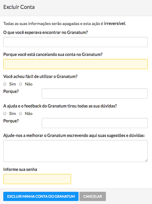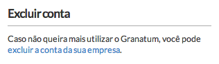- Clique no botão “Excluir minha conta do Granatum” (ATENÇÃO: a exclusão de uma conta é irreversível).
