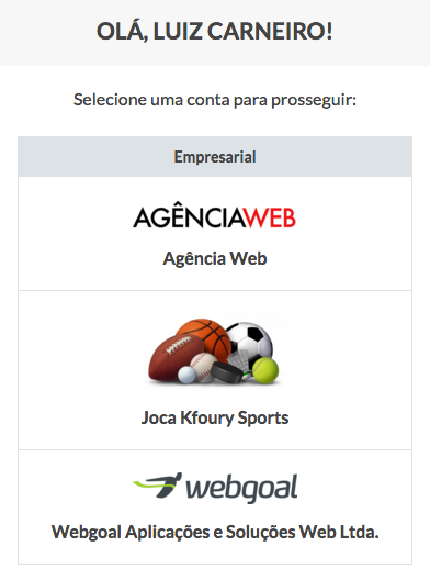 Ao fazer o login com seu e-mail e senha, você será direcionado para uma tela onde estarão listadas todas as contas associadas a este e-mail. Selecione a conta que será utilizada.