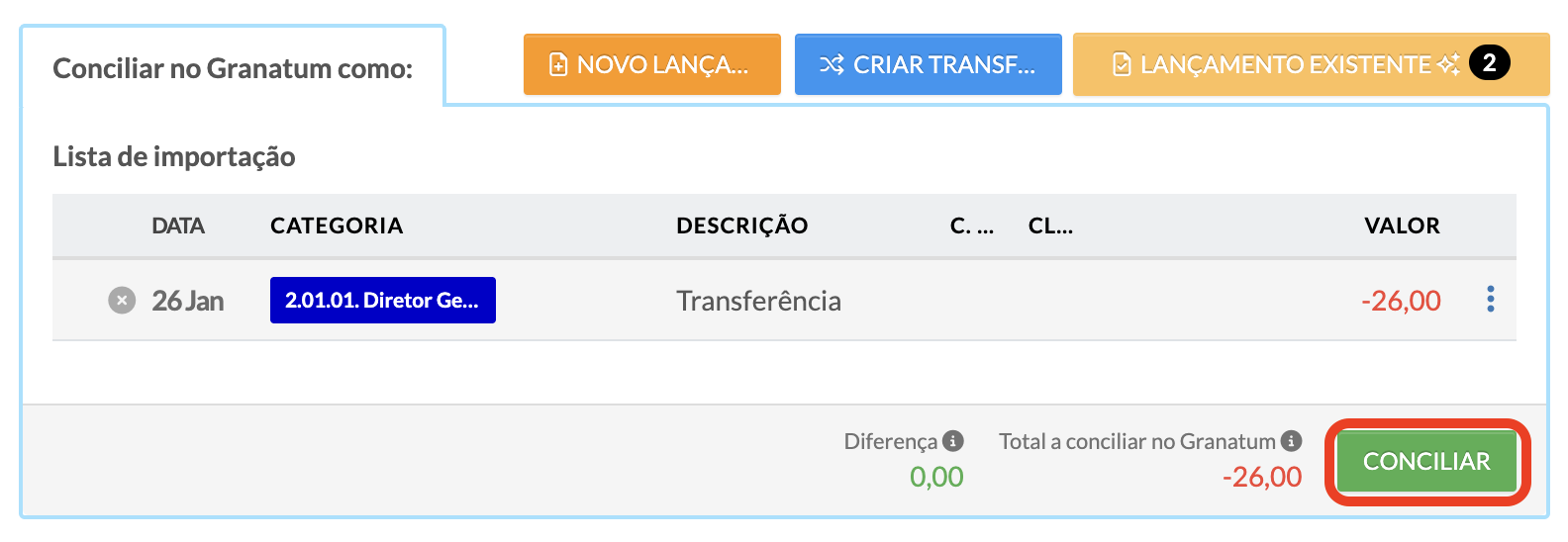 Se algum lançamento tiver sido conciliado errado, você poderá clicar em "Desconciliar".