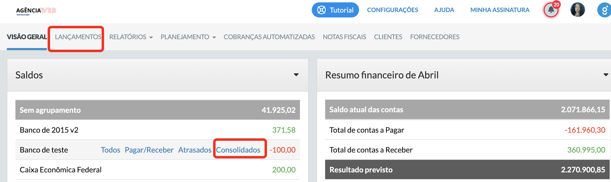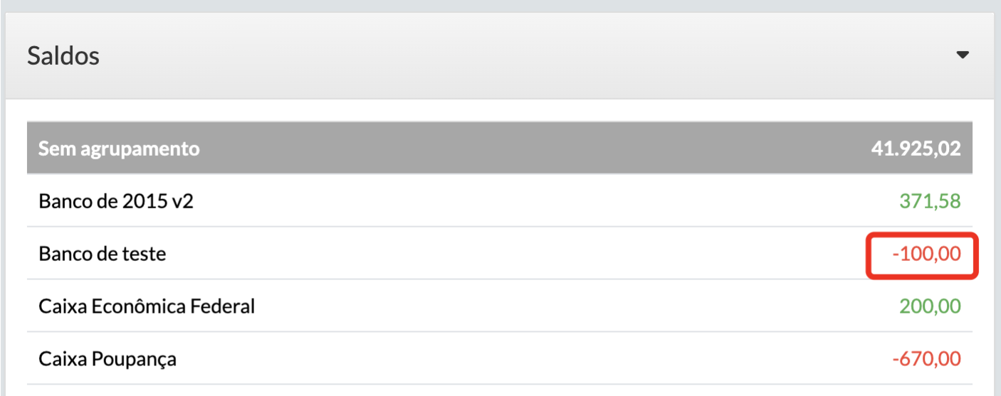 Confira o valor total do saldo atual no Granatum (positivo ou negativo).