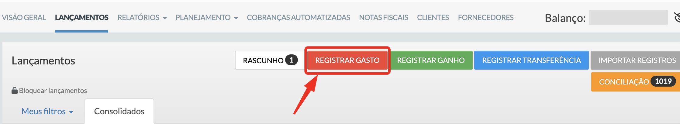 Se o saldo estiver maior no Granatum, clique em “Registrar gasto”