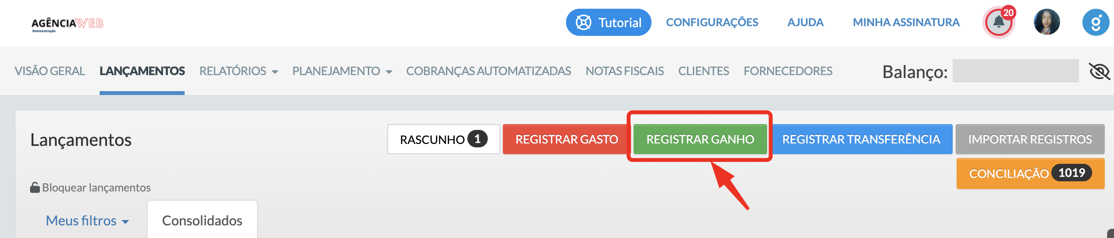 Se o saldo estiver menor no Granatum, clique em “Registrar ganho”