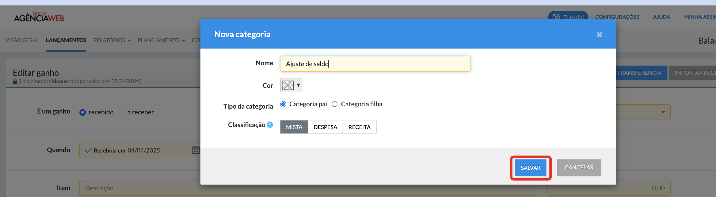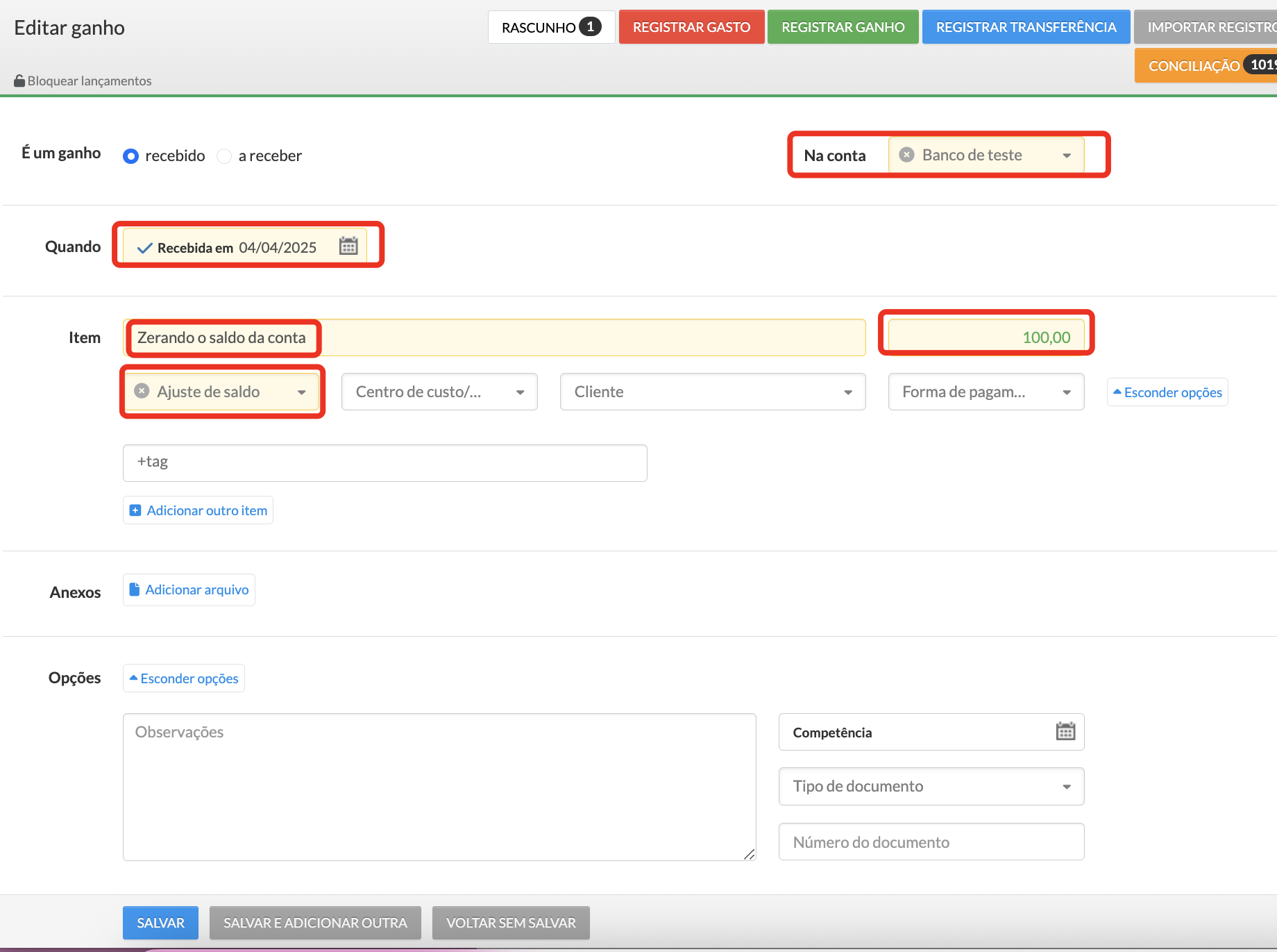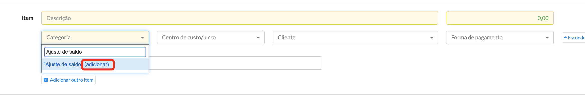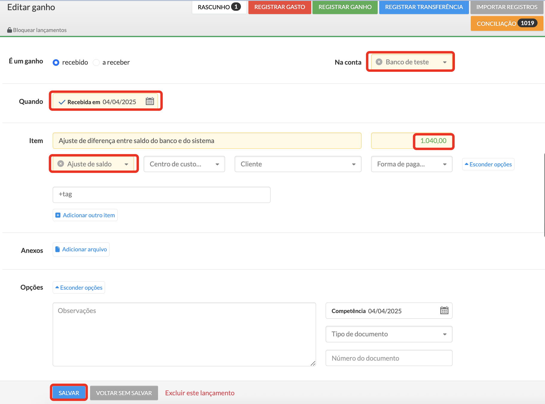 Para manter o histórico financeiro organizado, recomendamos utilizar sempre uma categoria específica para esse tipo de lançamento, como “Ajuste de saldo” ou “Correções de saldo”.