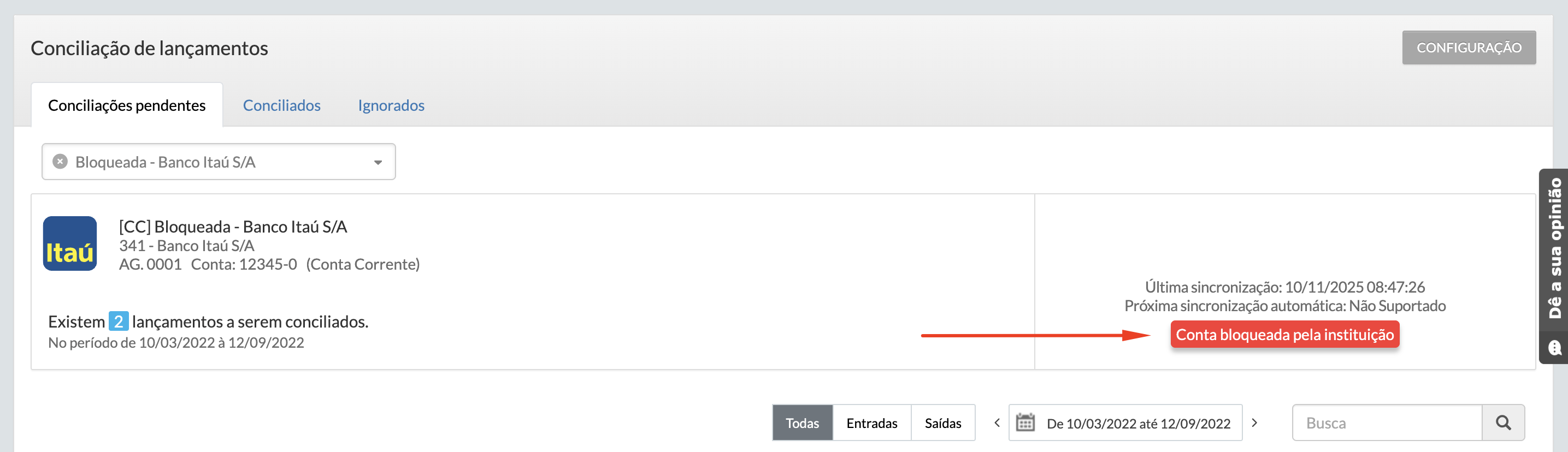 O bloqueio de uma conta pode ocorrer por diferentes motivos, a depender das políticas da instituição financeira. Nesses casos, o ideal é entrar em contato diretamente com o banco para entender o motivo e regularizar o acesso.Caso a instituição financeira bloqueie a conta, o aviso “Conta bloqueada pela instituição” será exibido na tela de conciliação bancária: