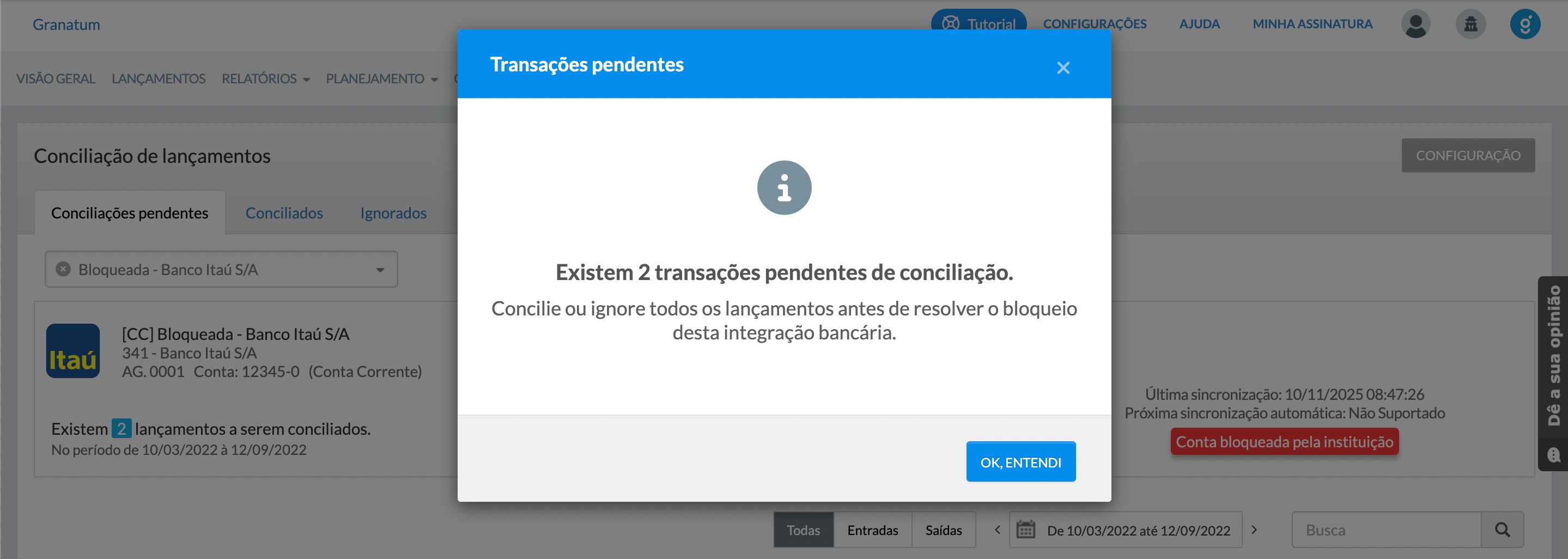 Ao clicar no botão “Conta bloqueada pela instituição”, o sistema verifica se ainda há lançamentos pendentes.