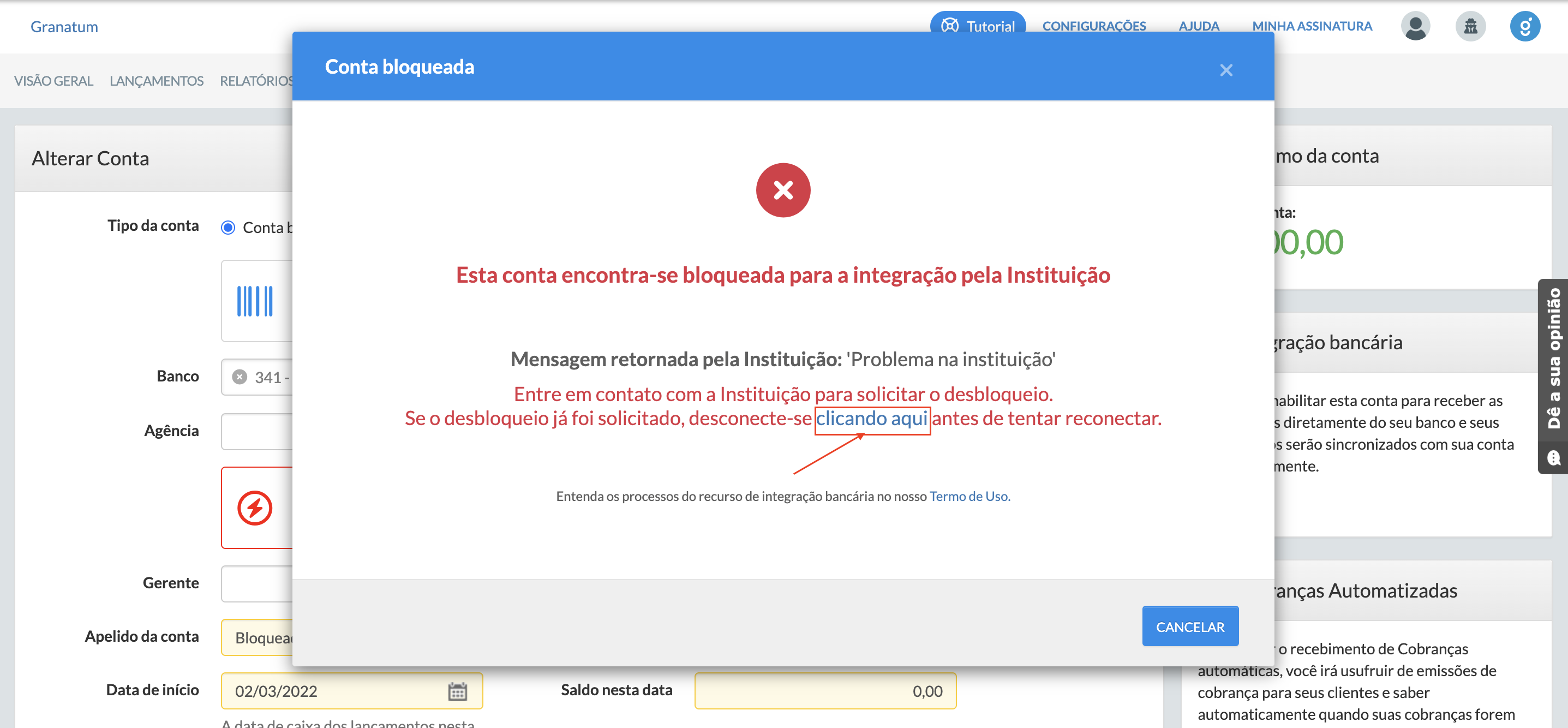 Algumas instituições exigem dois passos para concluir a integração. Caso haja qualquer problema durante o processo, como falhas de autenticação ou necessidade de começar do zero, você pode cancelar a tentativa atual diretamente pela interface.