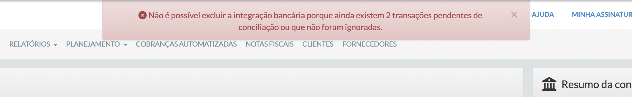 É possível gerenciar a integração bancária diretamente pela plataforma, seja para desativar, reiniciar o processo ou excluir uma conta bloqueada pela instituição, de forma simples e segura.