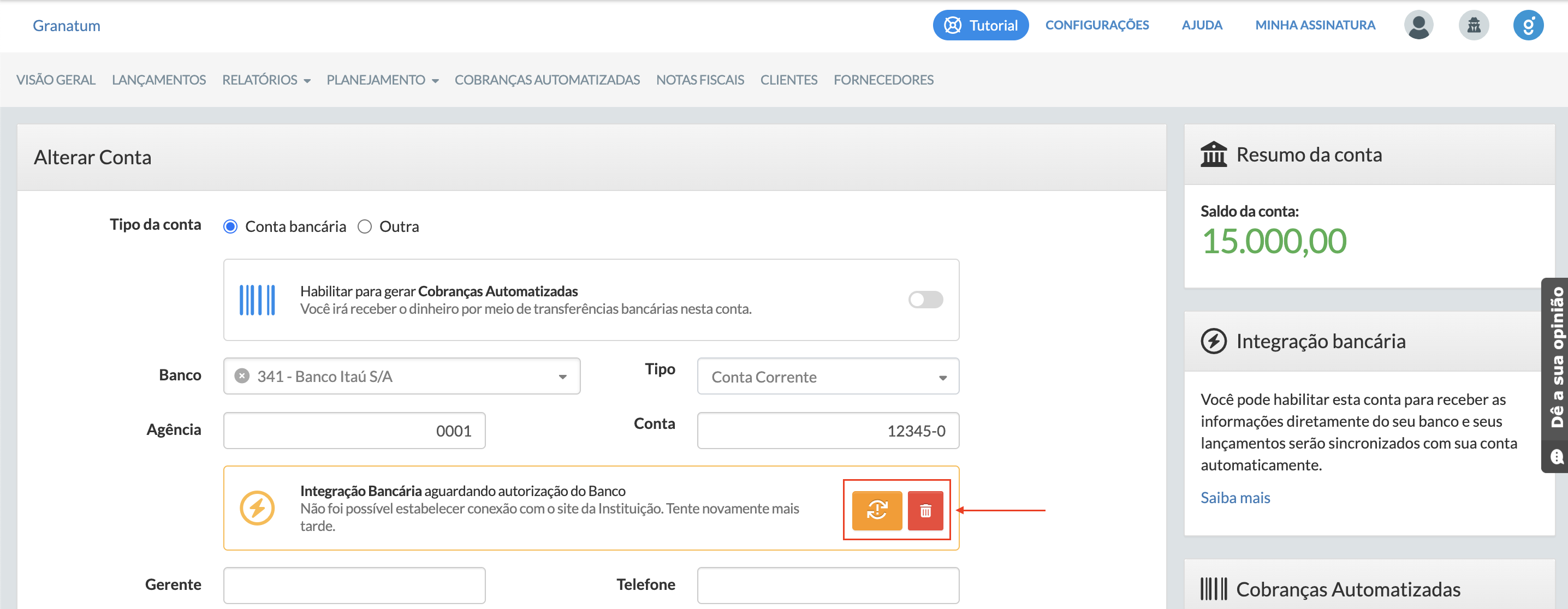 ⚠️ ATENÇÃO A exclusão da conta integrada desconecta a integração definitivamente. Esta ação não poderá ser desfeita! Caso deseje reconectar esta conta, você pode seguir o artigo: Como configurar a Integração Bancária no Granatum