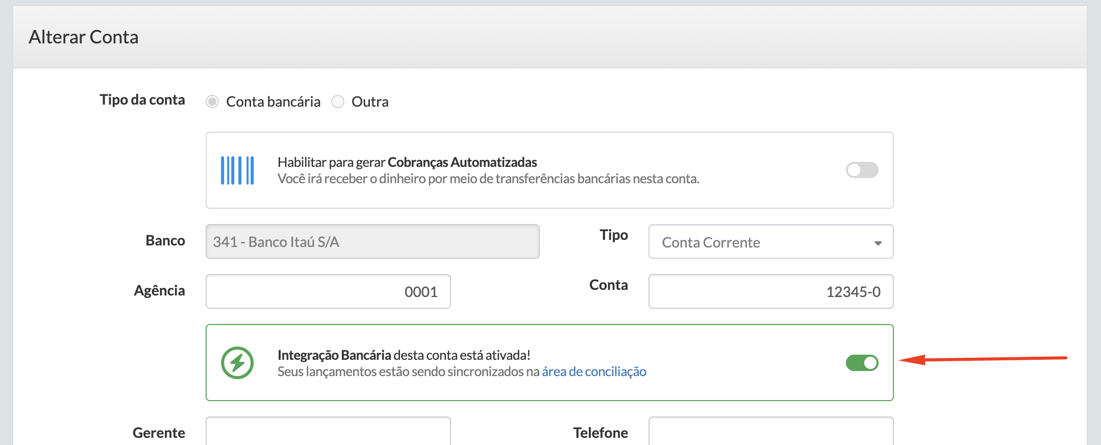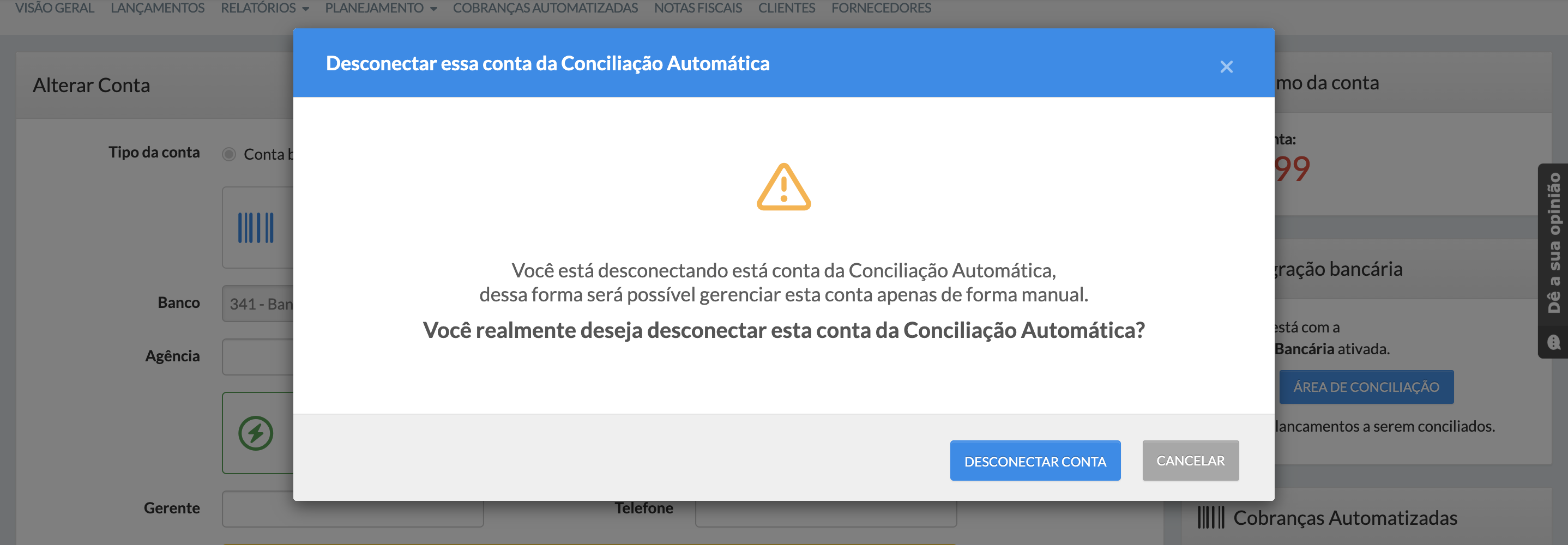 6. Após confirmar a integração será desligada, mas a conta continuará cadastrada normalmente, apenas sem a conexão automática com o banco. ✅