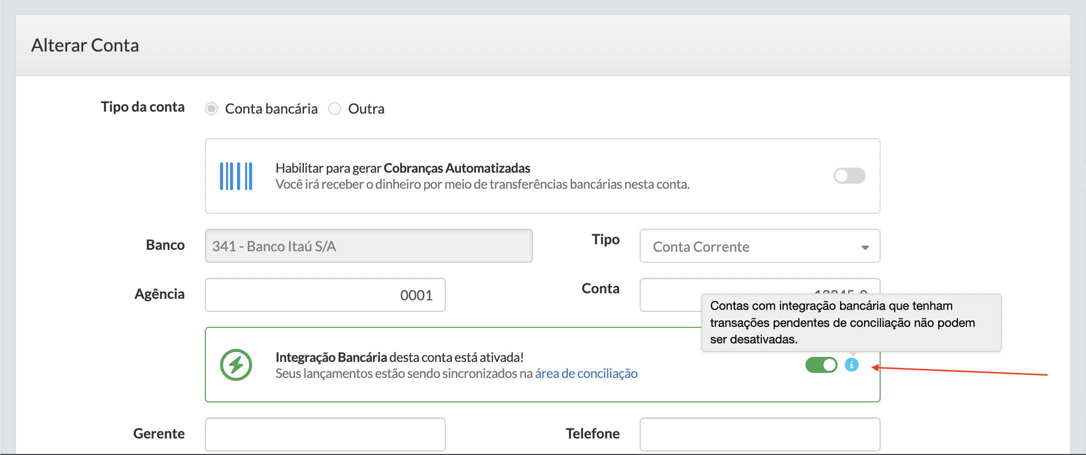 Contas com integração bancária que tenham transações pendentes de conciliação não podem ser desativadas.3. Após resolver as pendências, retorne à tela de edição da conta e clique no botão de ativar/desativar para desativar integração.