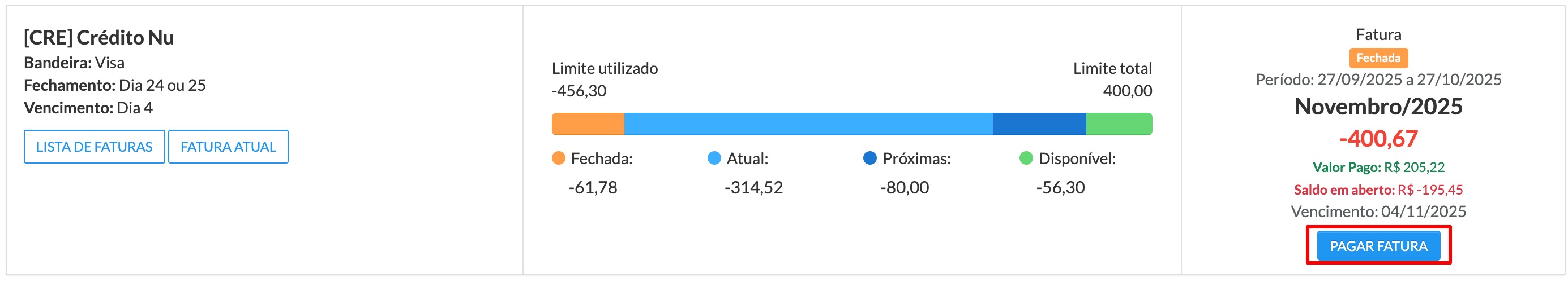No caso da fatura Atual, o status não muda para Paga enquanto a vigência estiver ativa, pois ainda podem acontecer novas compras.