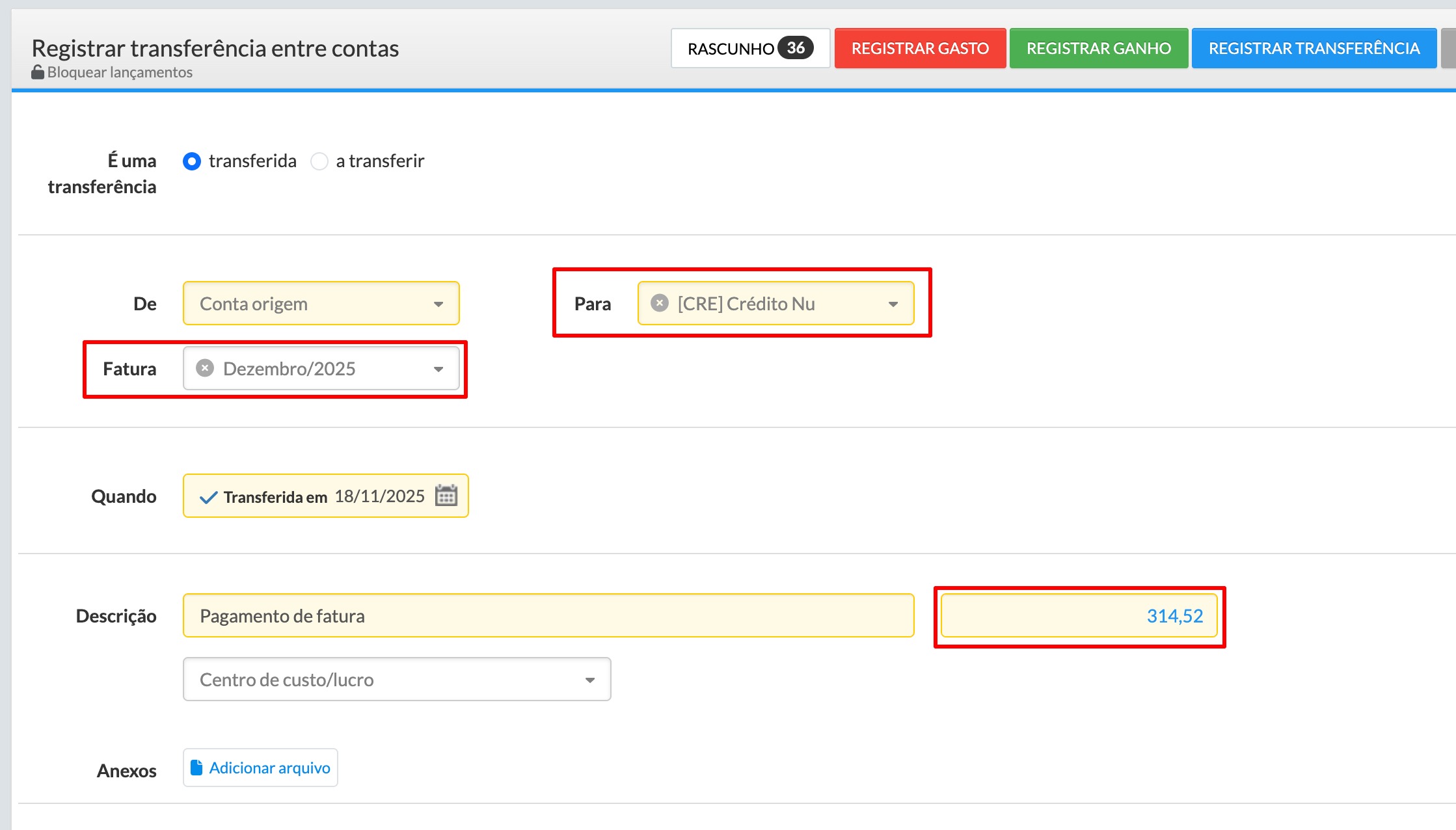 No Granatum, esse pagamento é registrado como uma transferência para o cartão de crédito.