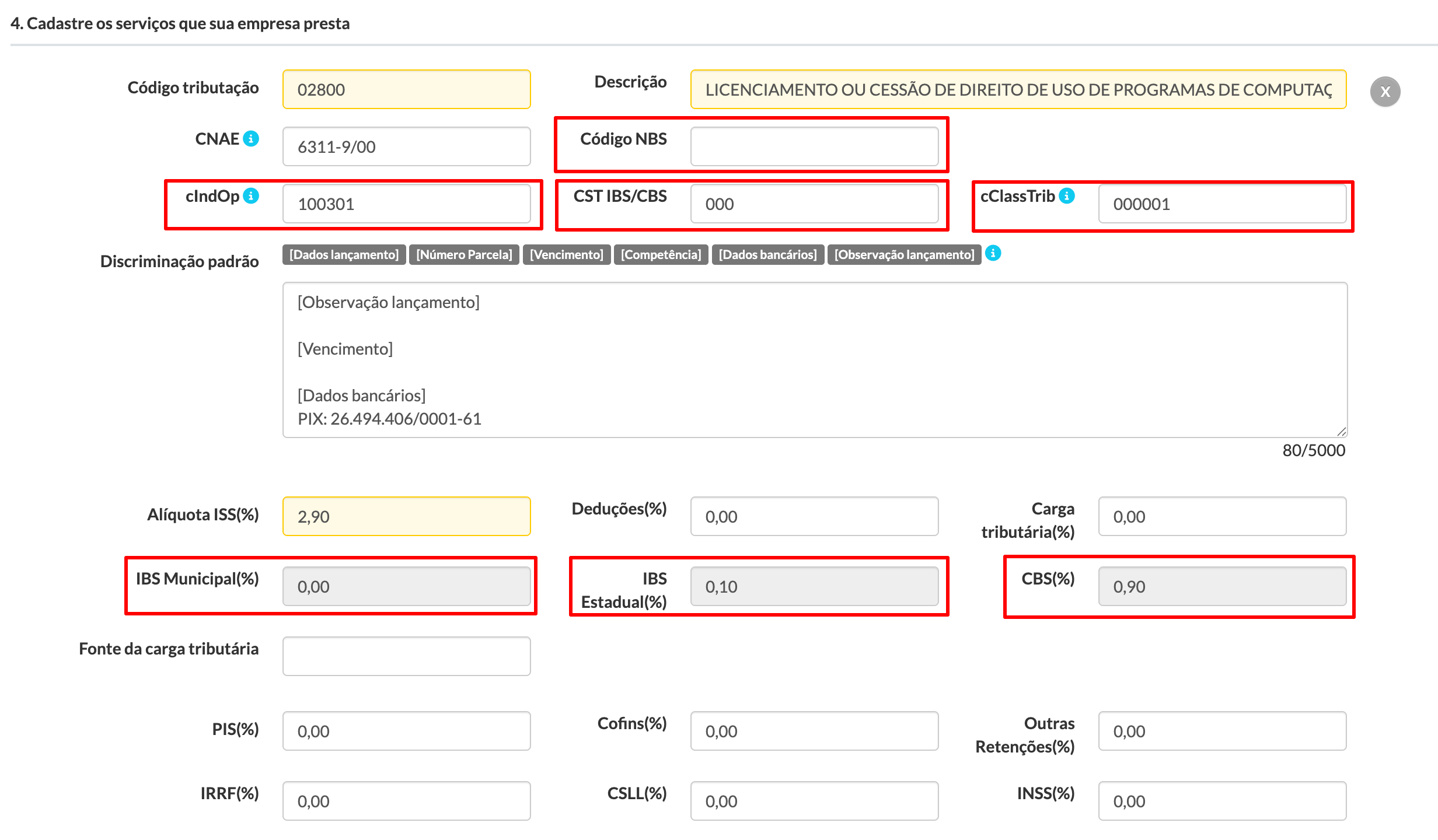 É ali que você vai inserir os códigos NBS, cIndOp, CST, cClassTrib e os demais dados exigidos.